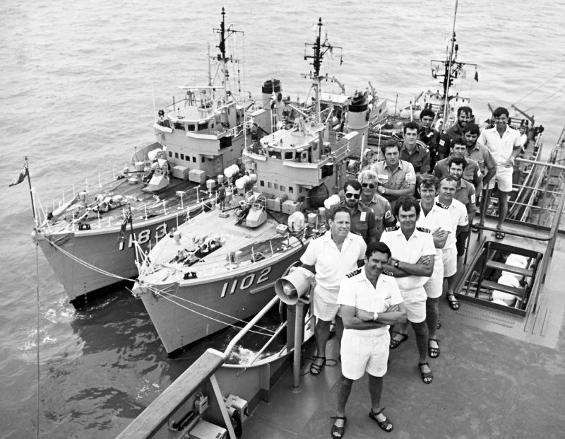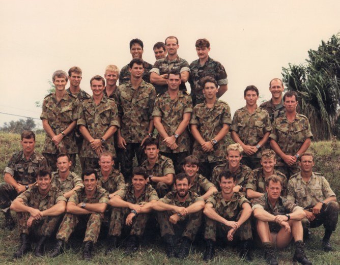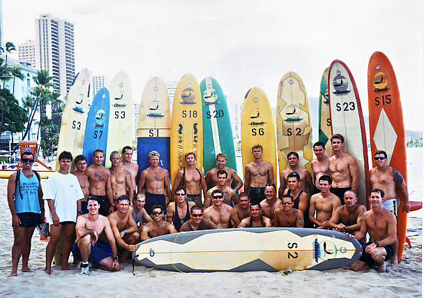Exercise Dugong 18 April - 06 May 1991. AUSCDT ONE in Guam back row - Russ Crawford, Graham Samway, Mal Macarthur, John Mead, Patch Pachini, Red Skelton, Mick Apathy. centre row - Mac USN, Jimmy Mason, Blue Elleby, Darren Skirman, Ray Moss, Jack Daniels, Dixie Lee, Mick Bending. front row - Tim Hunt, Harry Butler, Eddie Mauger, Vaughn King, Nobby Nobes, Harmon Slappy USN.