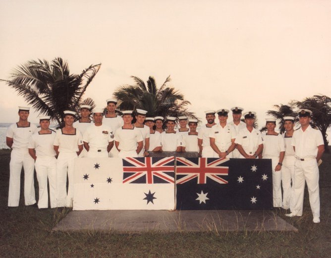 Anzac Day, Guam. 1991. L:R - Tim Hunt, Dave Moss, Mick Nobes, Mick Bending, USN on Exhange, Mac Mcarthur, Blue Ellaby, Jack Daniels, Jimmy Mason, Darren Skirman, Eddie Mauger, Dixie Lee, Harry Butler, Vaughn King, Graham Samway, Steve Dumscombe, Mick Apathy, Red Skelton, Patch Pachini, John Mead.