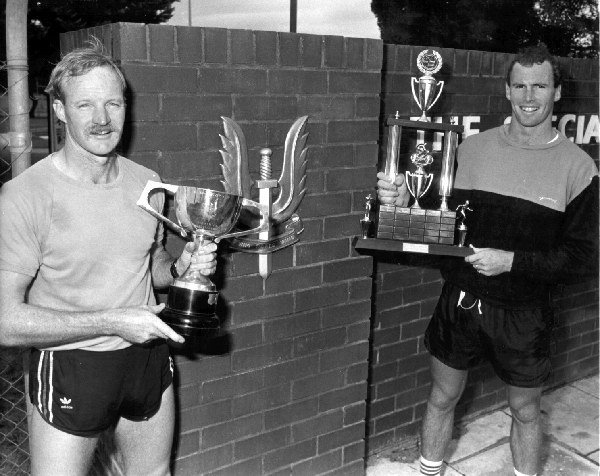 Rod Allchurch and Tim Hayes display their trophies after competing in a triathlon in April 1988.